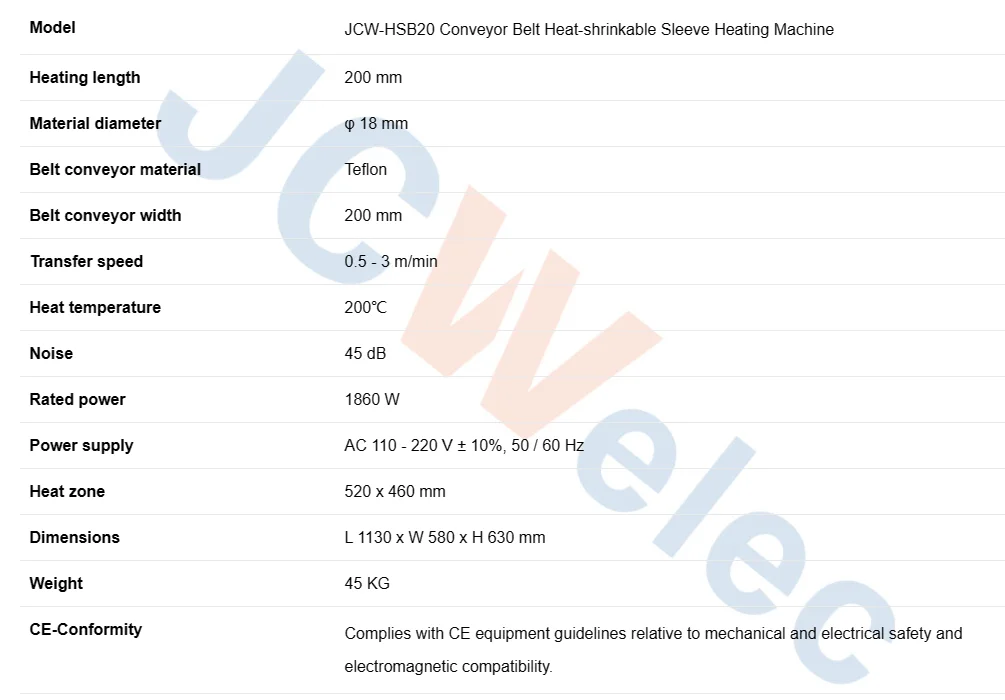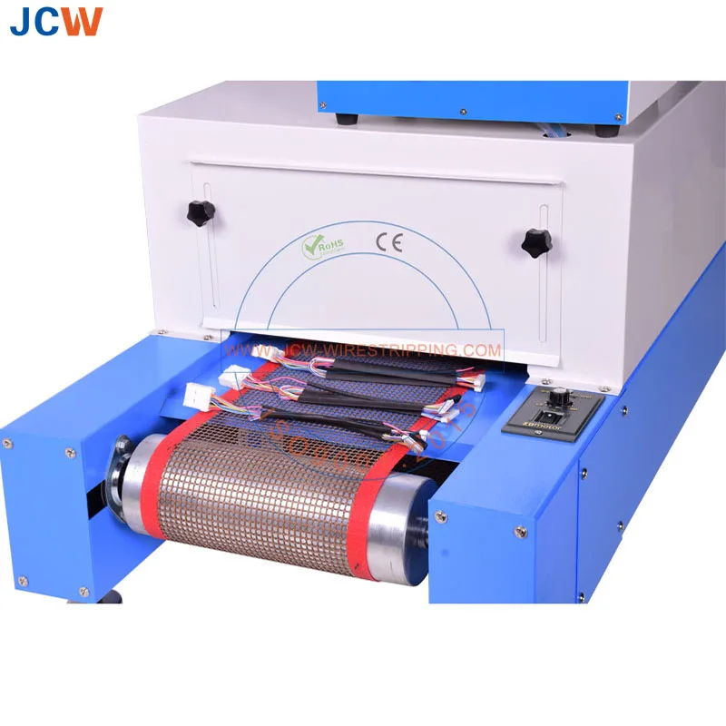 Teflon braided conveyor belt, 200mm in width Infrared radiation heating, closed-loop time and temperature contro Digital display heating temperature Safety grade PE ground wire Quick adjustment of heating tube height Material dimensions φ100 x L130mm