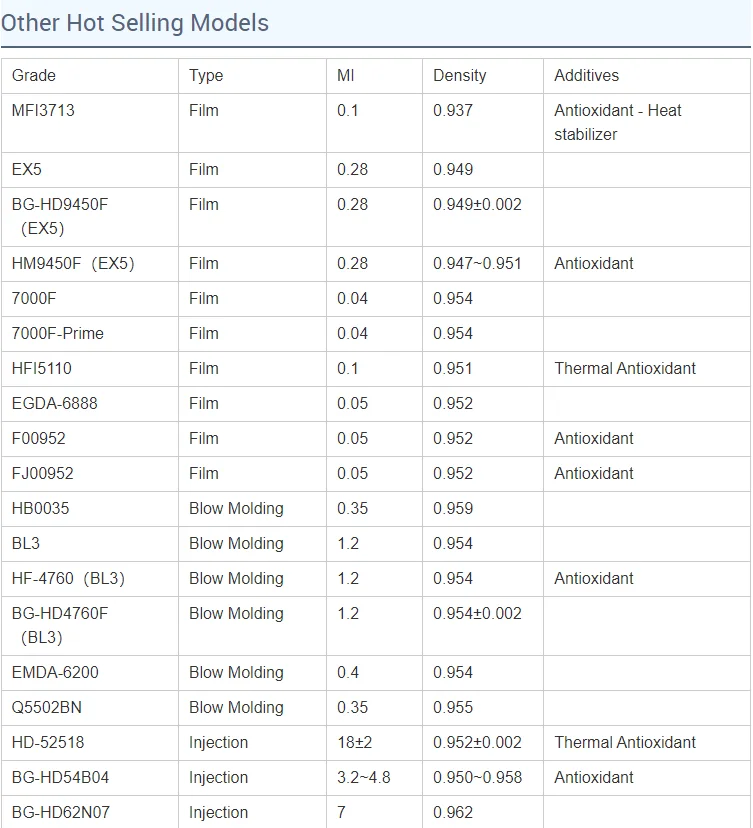 HDPE film grade is widely used in the production of T-shirt bags, shopping bags, food bags, garbage bags, packaging