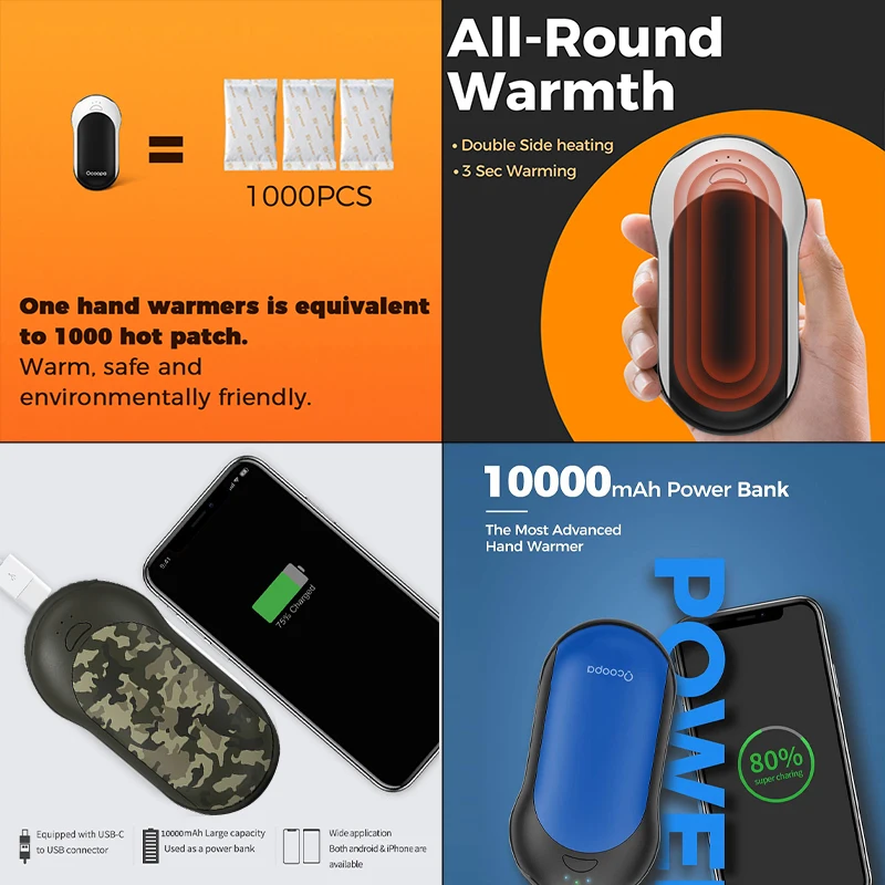 Ocoopa rechargeable hand warmer is made of ABS+PVC aerospace material, which is safe and environmentally friendly.
