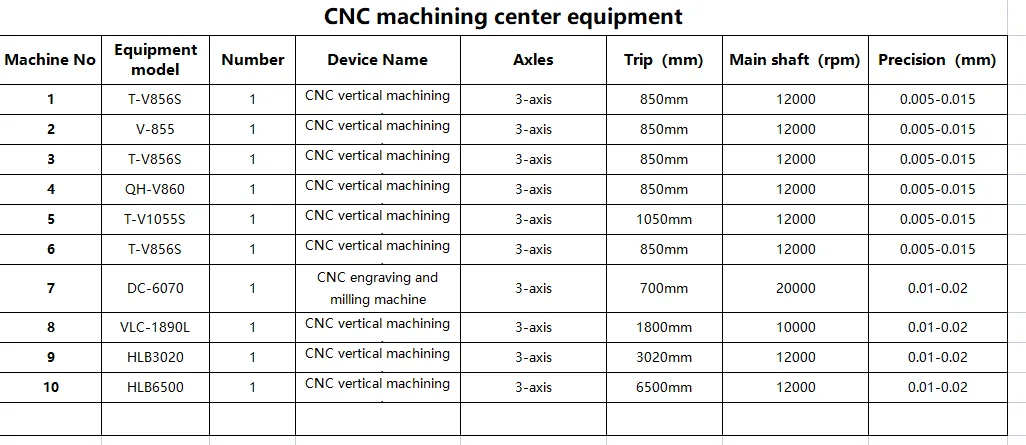 Testing equipment | CMM,Tool microscope. multi-joint arm;Automatic height gauge;Manual height gauge ;Dial gauge;Marble platform;Roughness measurement | ||||||