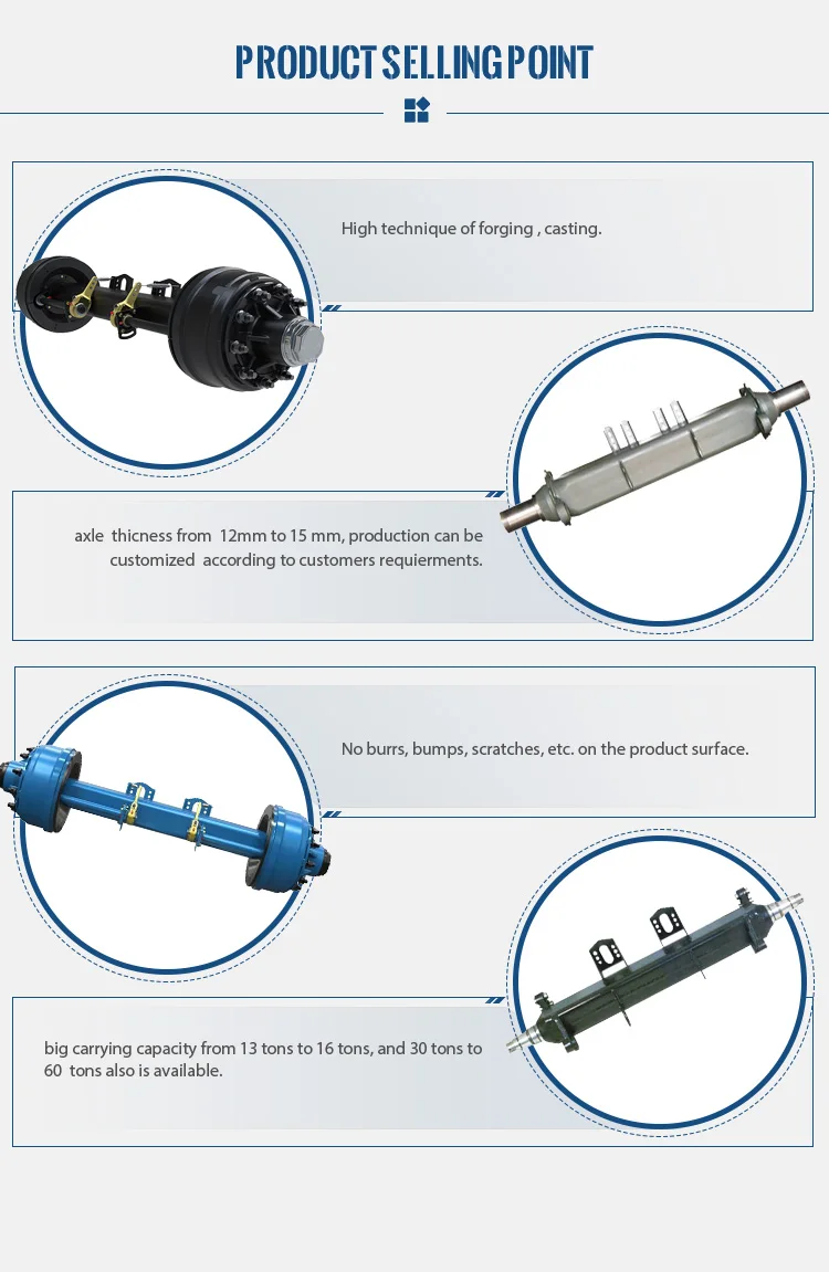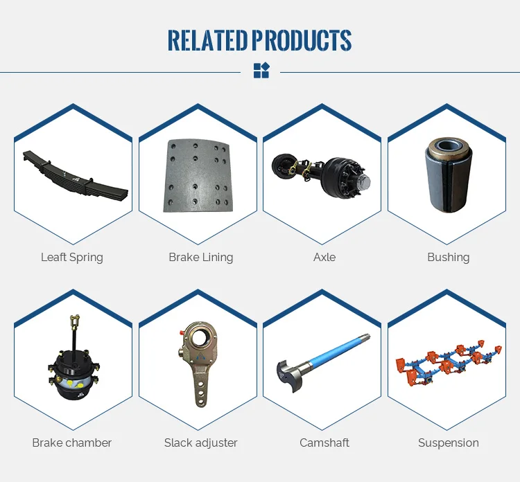 The company is professional in producing semi-trailer spare parts and almost all kinds of semi trailer. Main products Includes Slack Adjuster, S Camshaft, Leaf Spring, Brake Shoes, Brake Lining, Brake Chamber, Axle, Suspension, and so on.