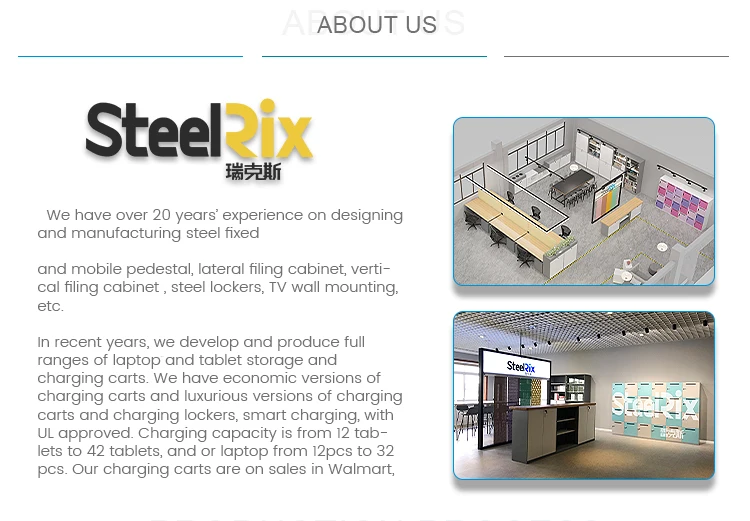 Steelrix is one of the leading manufacturers of office furniture in China. We have working area 30000 square meters, 200 workers, annual output USD15 million. Our capacity is USD30 million per year. We have over 20 years' experience on designing and manufacturing steel fixed and or mobile pedestal, lateral filing cabinet, vertical filing cabinet , steel lockers, TV wall mounting, etc. In recent years, we develop and produce full ranges of laptop and or tablet storage and charging carts. We have economic versions of charging carts and luxurious versions of charging carts and charging lockers, smart charging, with UL approved. Charging capacity is from 12 tablets to 42 tablets, and or laptop from 12pcs to 32 pcs. Our charging carts are on sales in Walmart, Staple, and many famous companies in US.
