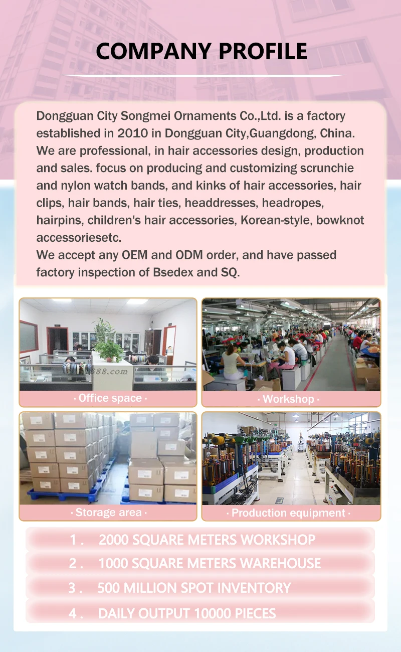 Dongguan City Songmei Jewelry Co., Ltd. was established in 2010. The company is located in Changping town, Dongguan City city, Guangdong province. It is a professional hair accessories company integrating design, production and sales. It has passed the factory inspection of Bsedex and SQP. Over the years, we have been focusing on producing and customizing all kinds of hair accessories, hair clips, hair bands, hair ties, headdresses, headropes, hairpins, children's hair accessories, Korean-style accessories, bowknot accessories and other products. The products are mainly sold in Europe, America, Japan, South Korea and other places, samples are welcome to be customized. We accept any objective evaluation made by new and old customers on our products and services, and actively improve our service quality. If there are special customization requirements and needs, we can also use online customer service, telephone, contact us by QQ, email and other means, and insist on making good products that can satisfy customers. Dongguan City Songmei Jewelry Co., Ltd. is Dongguan City Songmei Jewelry Co., Ltd. Its integrity, strength and product quality are recognized by the industry. Welcome friends from all walks of life to visit, guide and negotiate business.