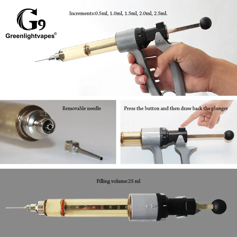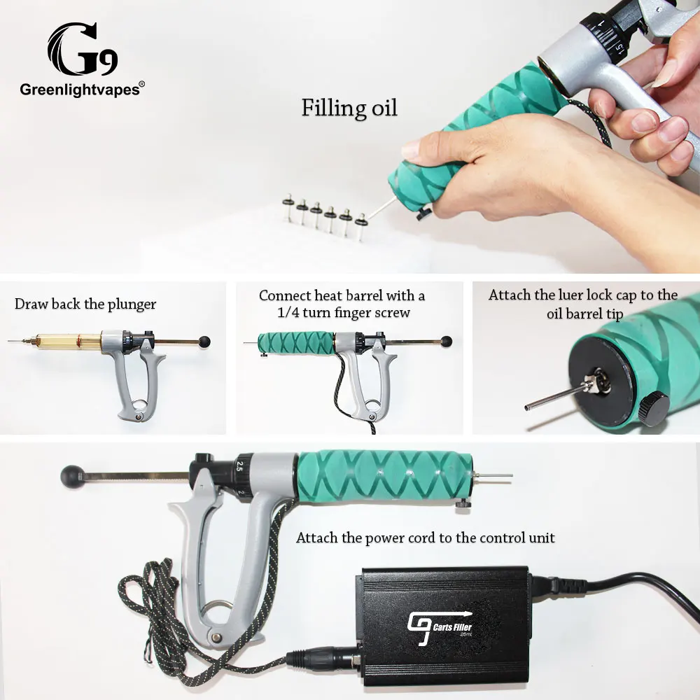 Cartridge filling machine provides an easy to read dial calibrated in 0.5ml increments for precise filling. The oil is injected with only a slight (.125”) squeeze of the trigger. A stainless steel piston measures a precise dosage through a no-drip stainless steel luer lock tip.
