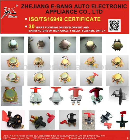 We are specialized in manufacturing various of electronically appliances, such as Auto Relays, Auto Flashers, Auto Switches and other parts for truck and bus. Welcome customers all over the world visiting and cooperation. We highly hope to establish business relations with you on the basis of mutual benefit in an earlier date.