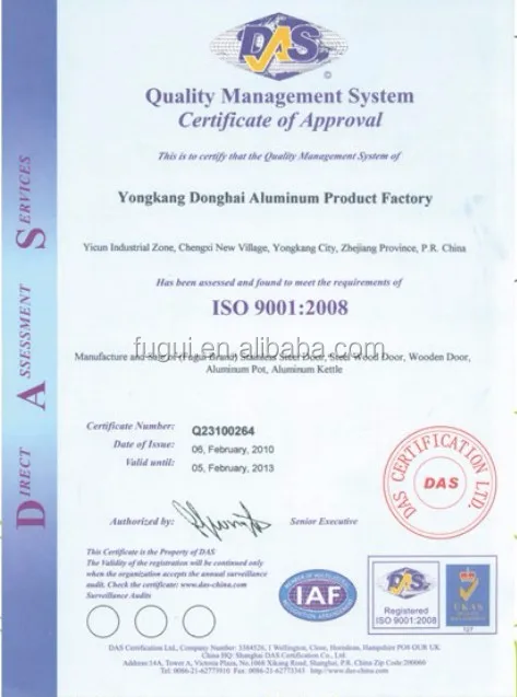 For kitchenware, our main products are the aluminum non-stick cookware, 7 pcs cooking pot set, polished aluminum pot, aluminum kettle, forged aluminum cookware, die-cast aluminum cookware, aluminum stock pot and aluminum pizza pan. As for doors, we have stainless steel door, steel security door and wooden door. Our products sell well in overseas markets North America, East and West Europe, Africa, Middle East, South America and Southeast Asia. Our products are welcome by the local consumers for its good quality and competitive price. we have passed the ISO9001:2008 quality and management standard inspection.