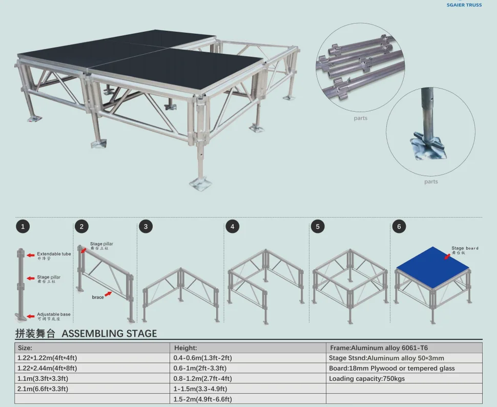 Stage Height | Adjustable:0.4-0.6M(1.3FT-2FT); 0.6-1M(2FT-3.3FT);0.8-1.2M(2.7FT-4FT);1.2-1.5M(4FT-5FT) Fixed: 0.4M(1.3FT), 0.6M(2FT), 1.0M(3FT), 1.2M(4FT)', 1.5M(5FT), OEM | ||||||