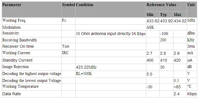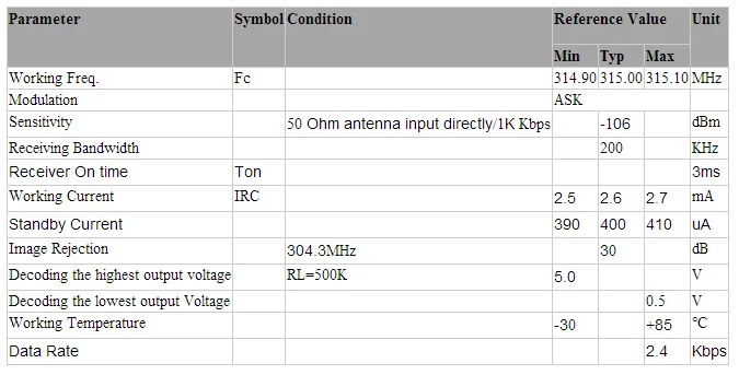 Low Current Consumption, 2.7mA when working and standby current is 400Ua (315Mhz)