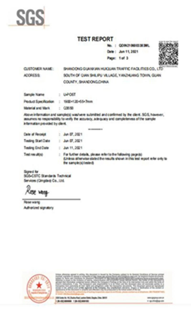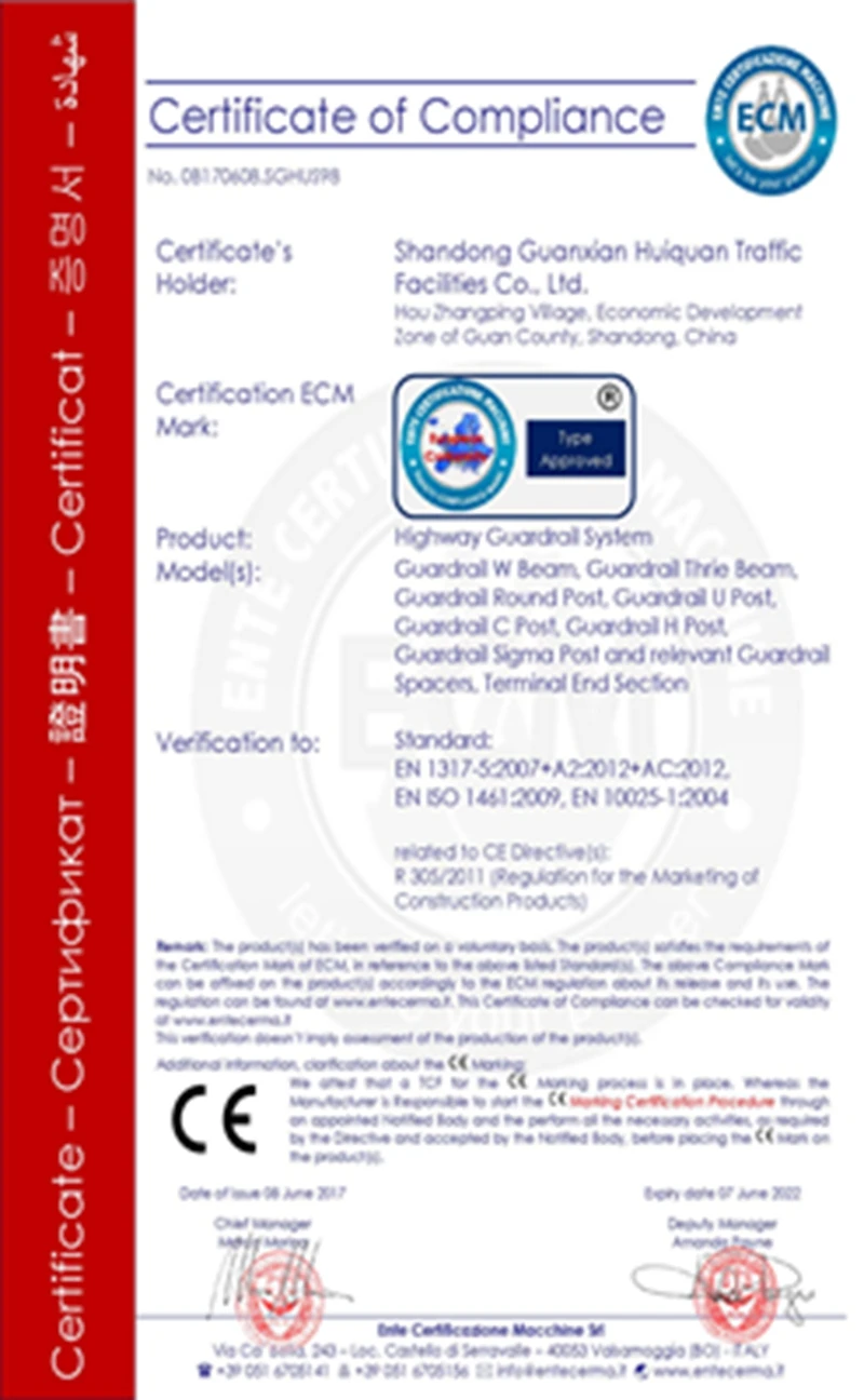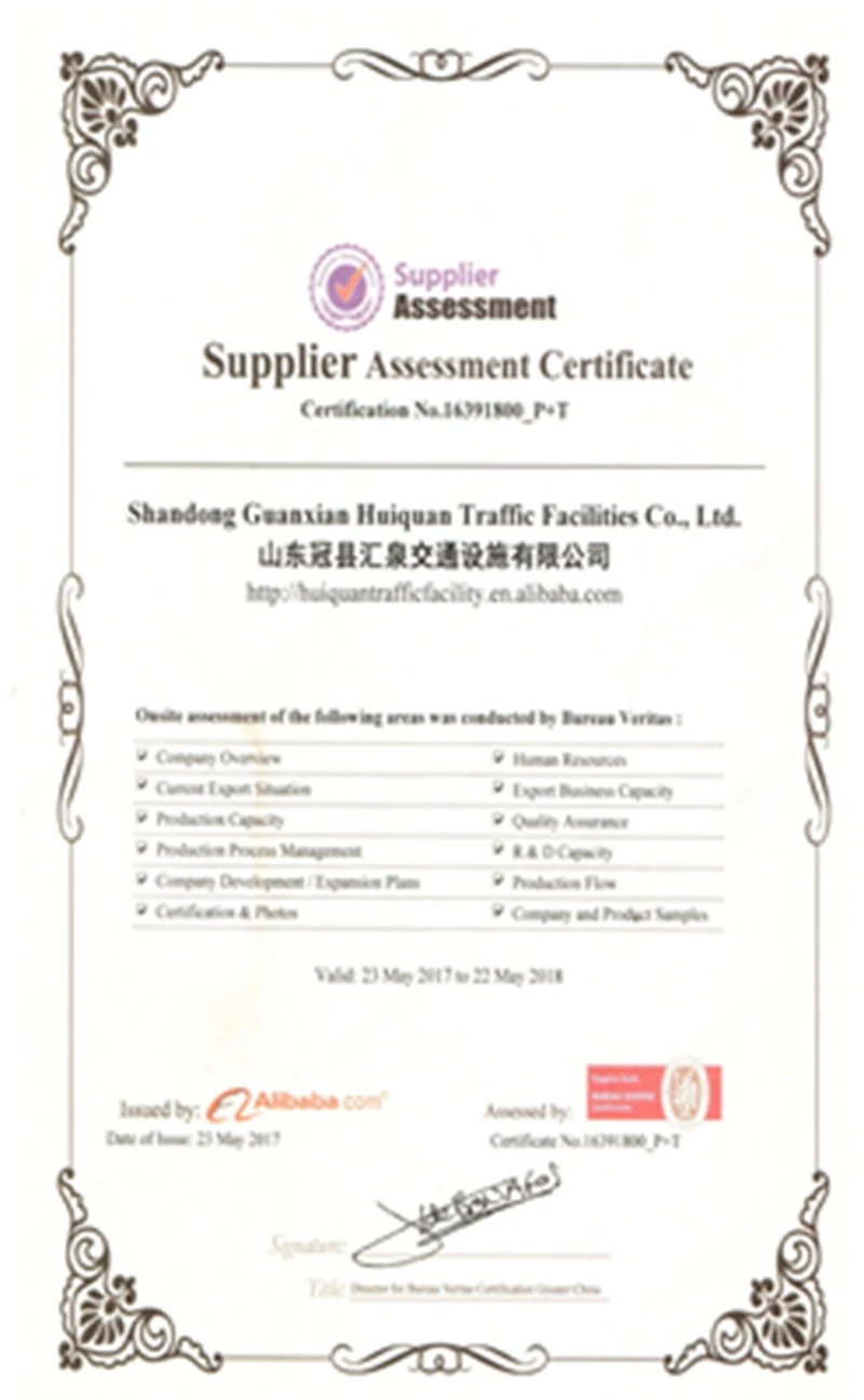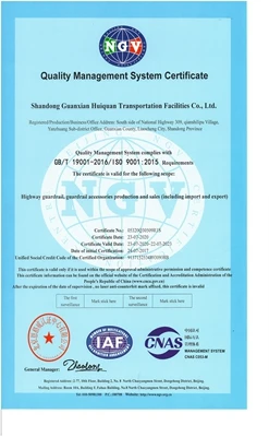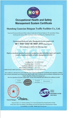 Huiquan is focusing on producing high-quality guardrail, each production process is carried out in strict accordance with ISO,CE. We have gained ISO,SGS,CE,BV and other certificates. The company is positioned to win the market and customers with high quality products and honest service. In 2017, Huiquan was designated as the supplier for the opening project of “the Belt and Road" highway project.