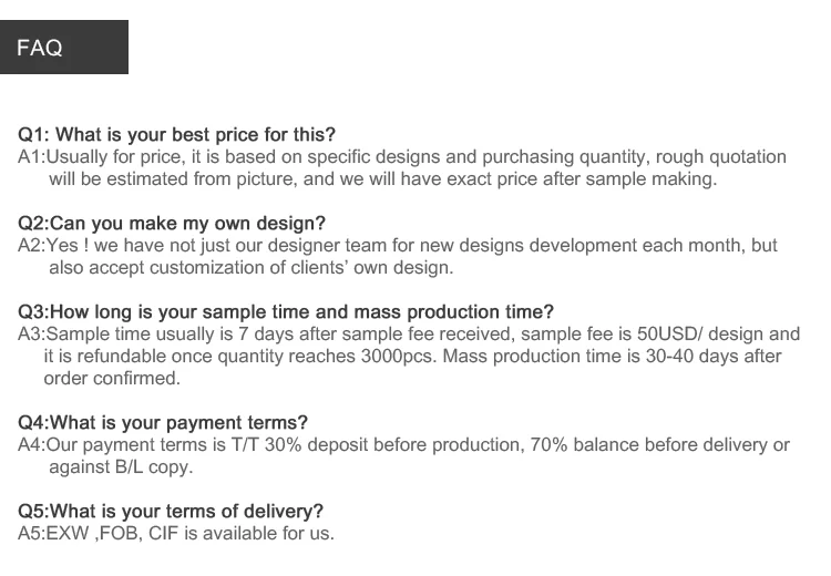Sample Fees | (Refund sample fees if actual order reaches 3000pcs) |