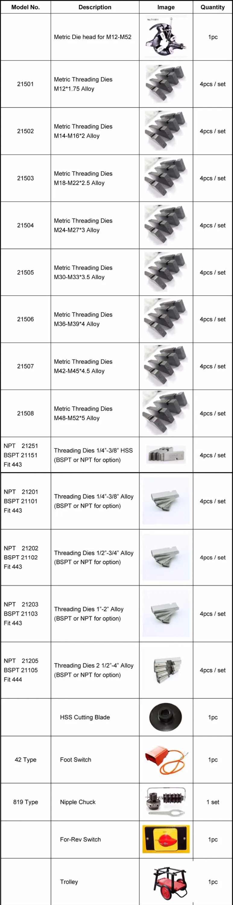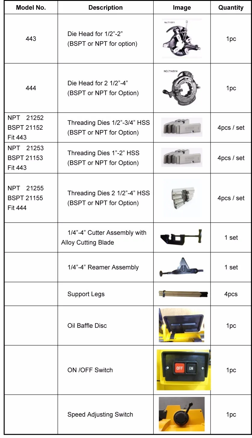 Catalog.No. | Model No. | Description | Spindle Speed RPM | Pipe Threading Capacity | Rod Threading Capacity | N.W.:(KG) |