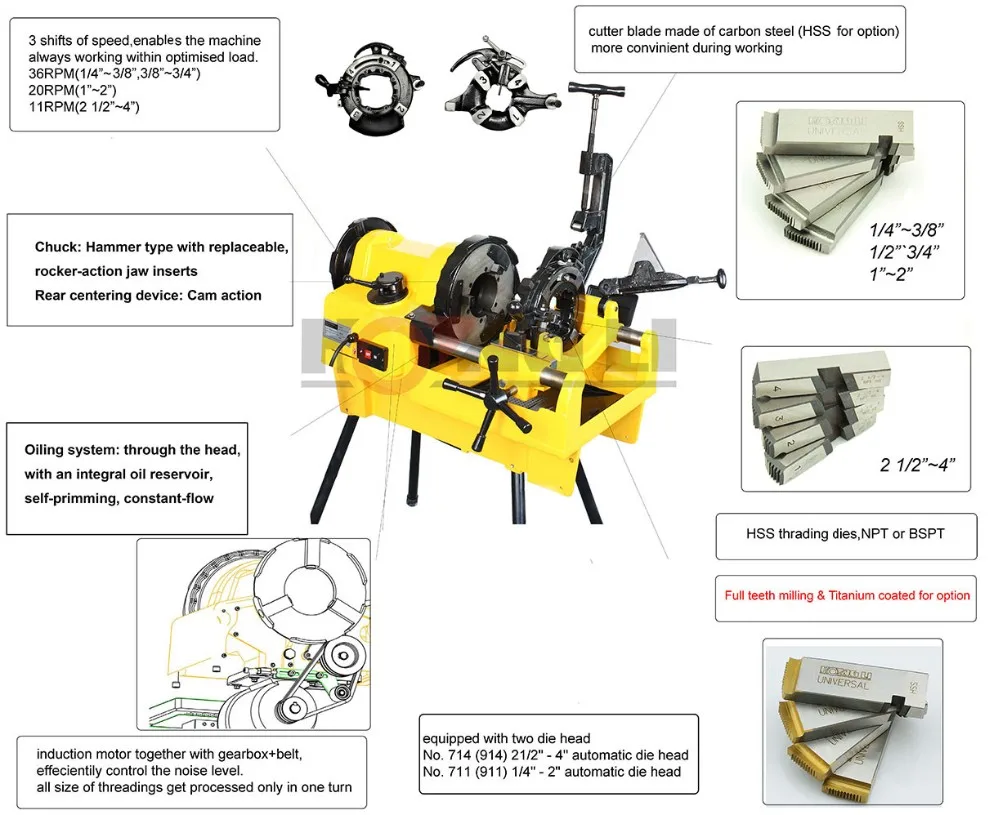 die head (1/2"-2"): automatic type, interchangeable with the die head for RIDGID 711/911