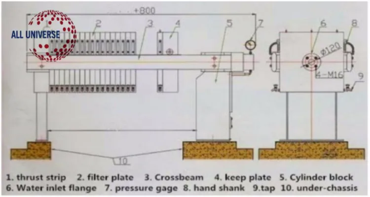 1. механический Электрический интегрированный моторизованный гидравлический автоматический вытягивающий камерный фильтр-пресс, диаметр гидравлического масляного цилиндра 200 мм (Он изготовлен из 45 # бесшовной стальной трубы, шток поршня 45 # сталь); высокопрочная стальная конструкция стойки, панель 16 марганцевая пластина, перекладина 16 manganess низкоуглеродистая легированная стальная пластина (толщина 30 мм), перекладина мешок из нержавеющей стали, Цепь из нержавеющей стали и Тяговая пластина сосуда.
