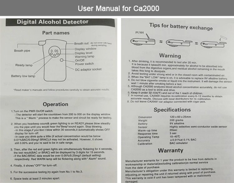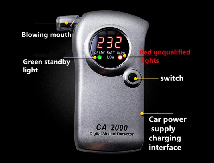 -CA2000 является высокой точностью, высокой реальностью, дыхательным цифровым детектором алкоголя. Его основной компонент использует новый тип высокотехнологичного микрооксида полупроводника, который может точно обнаруживать газовый спирт без помех от дыма, колы, кофе и других безалкогольных газов. CA2000 компактный, легкий, 120*60*25 мм, весит всего 200 грамм. Это лучший выбор для портативных приложений.