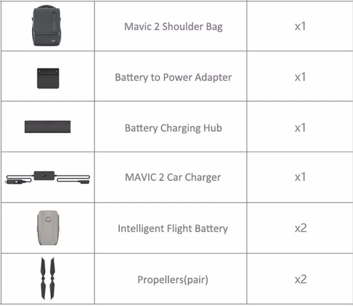 Mavic 2 Fly More Kit включает в себя две интеллектуальные летные батареи, автомобильное зарядное устройство Mavic 2, зарядную ступицу для аккумулятора, аккумулятор для адаптера банка питания, малошумные пропеллеры, и сумка через плечо Mavic 2, обеспечивающая всестороннюю поддержку во время съемки.