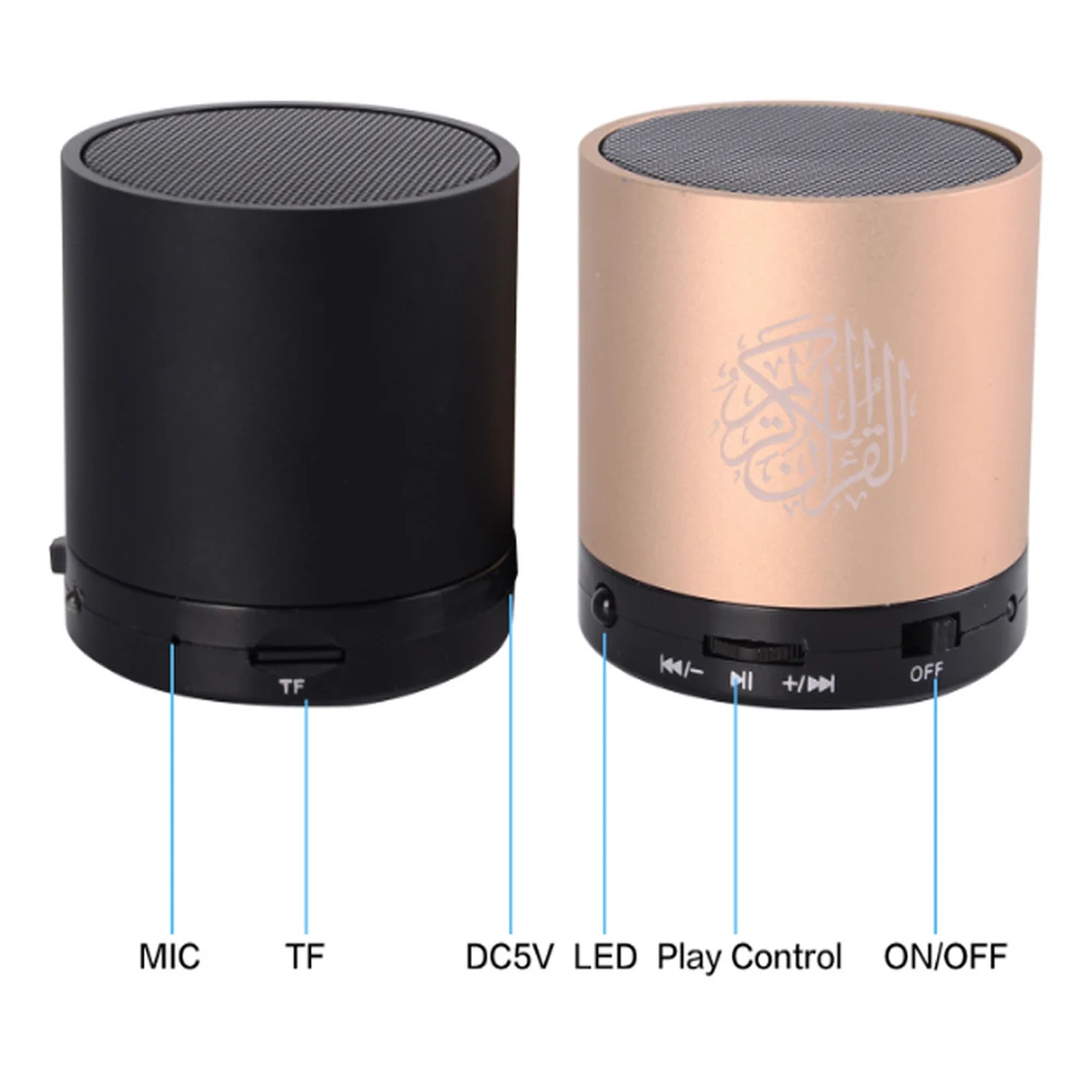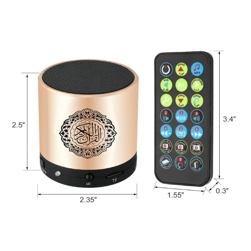 Features | HHD Quran Audio 25 reciters Quran Translation Audio (25 language.) *8GB *Fast Surah Selection(NEW) *Digital Quran *RGB Lamp *Warm light *Wireless BT V5.0 *FM radio *360 lighting *Touch key *40hm 5W *3 Time - off *Ape Flac *Sahih Al-Bukhari/Hisnul Muslim/Sahih Al-Muslim/Hajj&Umrah*Tafseer Sharavi/Ak-Ruqyah *Working Time: 18-20H *Battery:Interal Li-ion Rechargeable Battery 2000mAh *Translation Voice:35 *1.6w Lamp Power *Blue tooth 2.1,10 meters Remote control. |