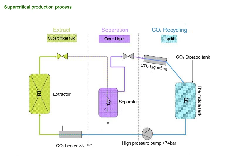 Supercritical fluid CO₂ technology is a new and clean isolation technology, which exploits the special dissolving capacity of CO₂ and target substance under supercritical condition by controlling CO₂ pressure, temperature, etc., to dissolve and isolate target substance. Compared with other traditional processes, it shows incomparable advantages, such as, using inert gas as solvent, cheap and easily accessible; pollution-free and environment-friendly; simple process; no residue of chemical solvent in target substance which guarantees the quality of target product.