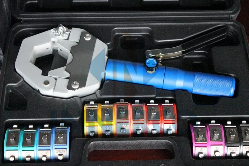 The lightweight hand-held hydraulic press is very portable and ideal for shop and field operations. The kit comes with a complete set of dies covering hose sizes: #6, #8, #10, #12 and reduced barrier hose sizes: #6, #8, #10 and #12 in a custom molded carrying case.