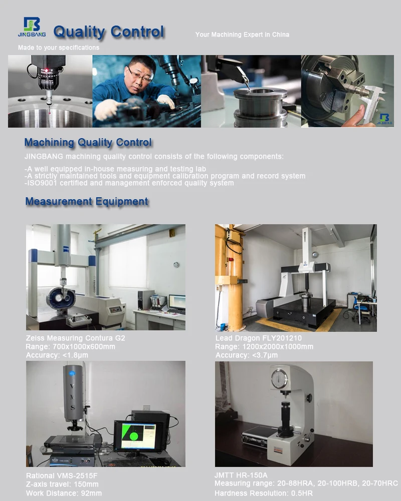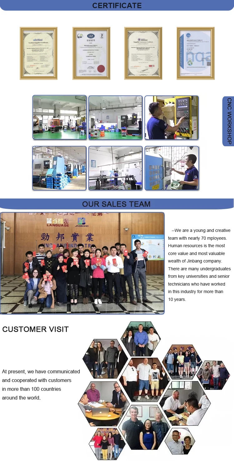 Shenzhen Jingbang hardware electronic Co., Ltd was found at 2011 in Shenzhen. Our factory has two floor plant, the workshop is 4000 square meters,including of CNC machine workshop,Lathe workshop,milling workshop, QC testing room and warehouse. Our main Products: Motorcycle Handlebar lock, Shaft collar, synchronizing wheel, Knob, speaker base, spike, Anti-theft screw, Anti-theft nut, Non-standard screws, Non-standard nuts, and Hardware custom parts. We can make the hardware custom parts as your request if you provide the 2D/3D drawings, we can provide produce quantity as your request timely for that we have 26 unit CNC machine in our workshop. Our QC test team use the following tools to check our produce 100% and make sure of quality: vernier caliper, outside micrometer, 2D/3D measurement, project measurement, blue light scan, plating thickness, hardness tester, salt spry machine and so on, we can make precision as 0,001mm!