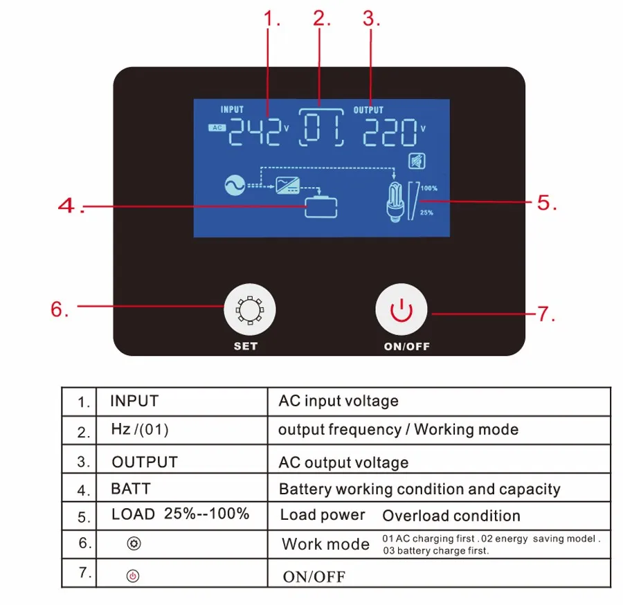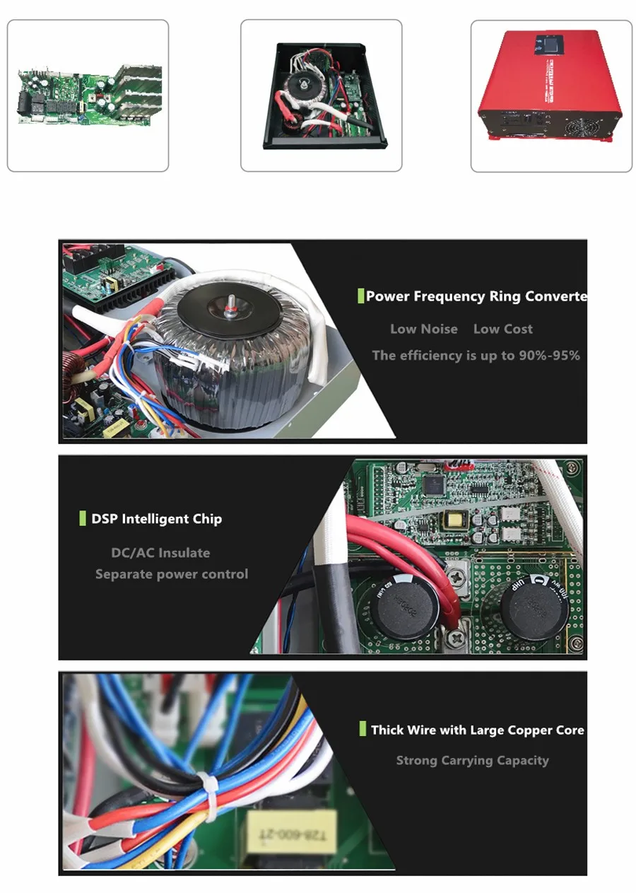 This is a pure sine wave inverter with AC big current charge, LCD display offer users-configurable and clear data. Easy-to-operate button operation such as battery type and Battery or city power priority, battery voltage, load, Input and output voltage query. It can use for solar power system, light, radio, DVD, TV set, fans, freezer, computers, small hand-drill, communication equipment and the other house appliance.