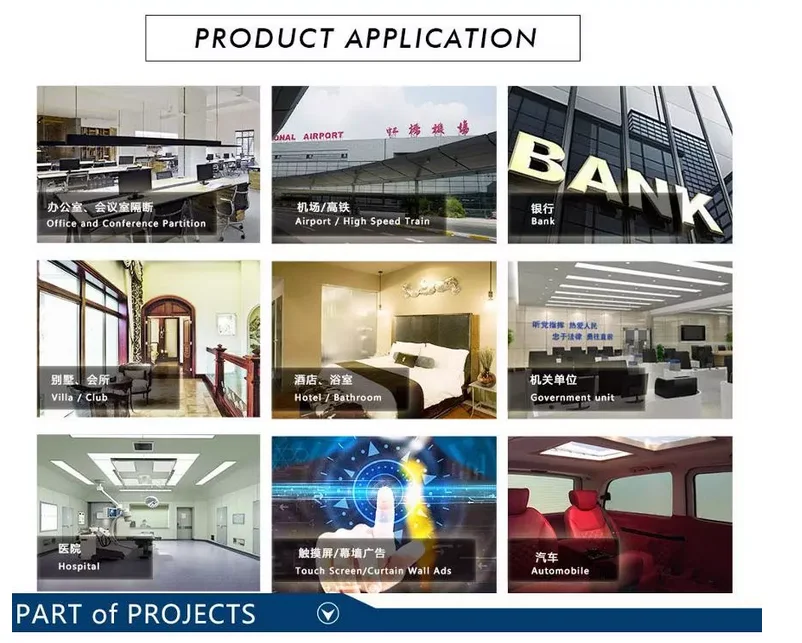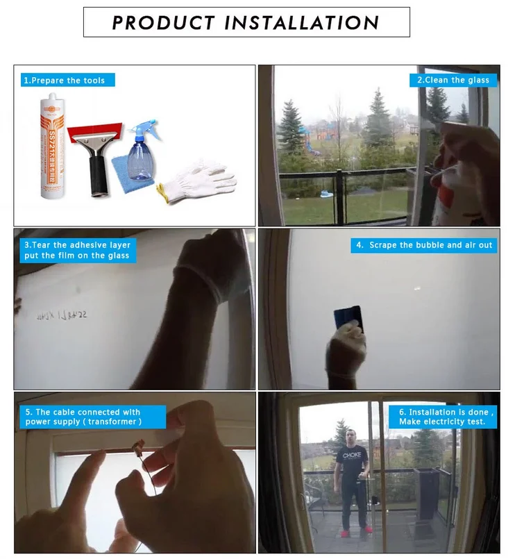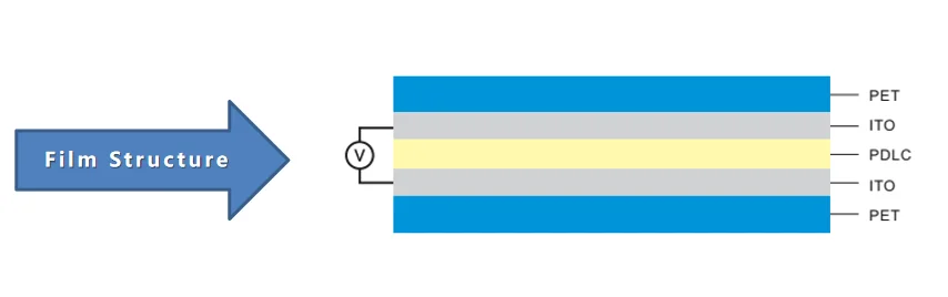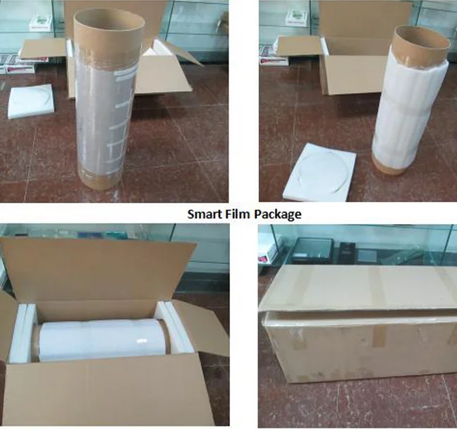 Self-adhesive film can be pasted to the glass directly. It also gets transparent when power on and frosted when power off. SSF combine with protection film, ITO and AB glue. Exsiting glass will be changed to smart glass after pasting SSF on it .