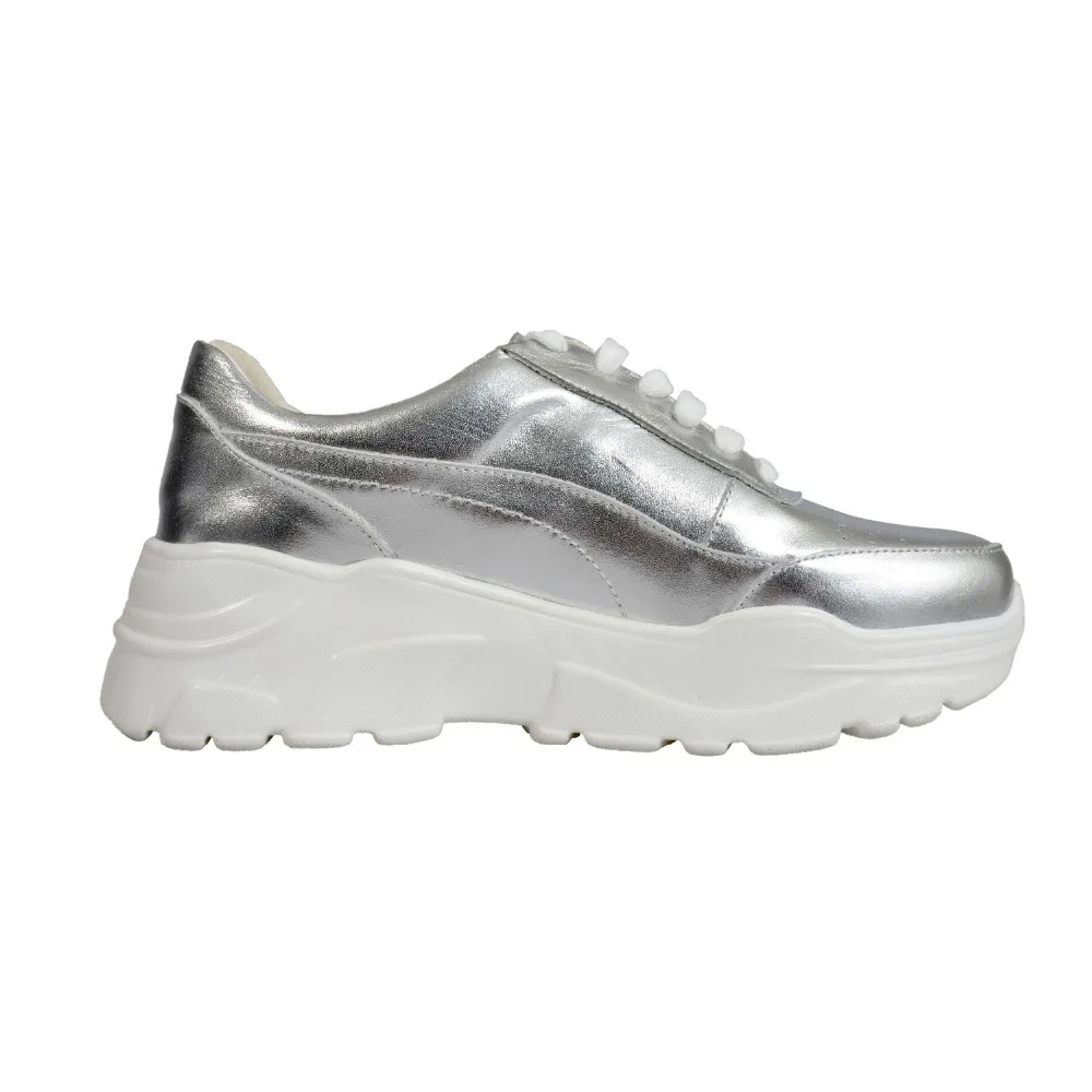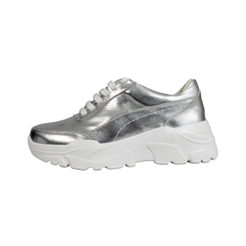 MANRINO-0374 Lady Sneakers Comfortable Lace Up Thick Unit Rubber Sole Metallic Silver Leather Upper Womens Sports Shoes