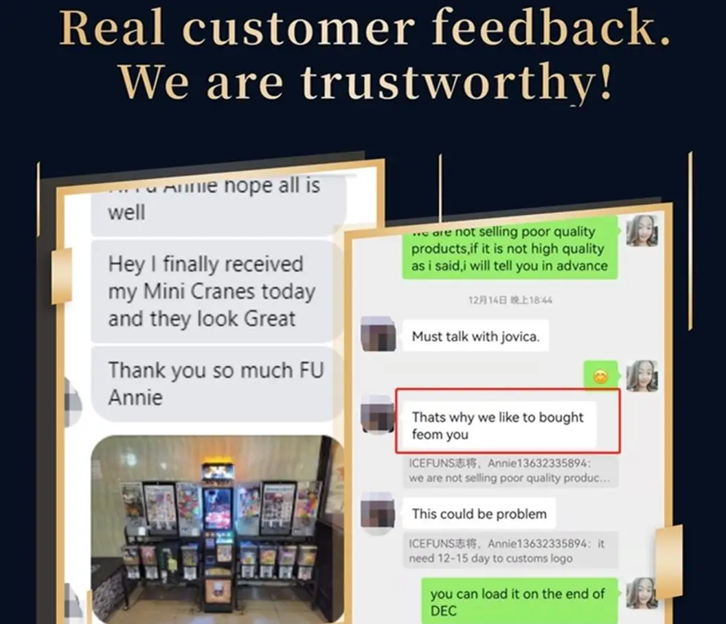 Why choose ICEFUNS AMUSEMENT | -we have 15 years of experience in producing claw machines and prize machines. -Our boss is from Taiwan, factory is in Guangzhou. -All products are developed by ourselves, including software, motherboards, cranes, etc.he have strictly demands for product's quality and details -support customization and secondary development.(crane machine and prize machine) -we have much experience to cooperated with big company such as TIMEZONE and TOMS WORLD -24 hours online technical support,Visit customers and provide technical training at least once a year,but only limited to the United States and some European countries (because we attend IAAPA exhibition each year,we will arrange technicians to visit customer together to help customers solve problems and provide technical training | |