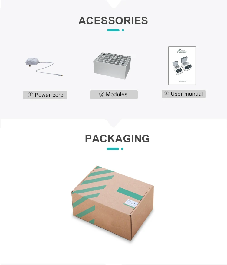 1. Instant temperature display,both heating and cooling 2. multiple program running,9 programs can be set freely 3. Temperature deviation Calibration function,±0.5℃ 4. built-in safety device for over-temperature 5. Intelligent algorithm 6. Automated recovery of power cut 7. Multiple modules options:0.2mlX96,1.5mlX24,2mlX24,15mlX8,50mlX4.And OEM is available. 8.Shaking speed range 200-1500RPM