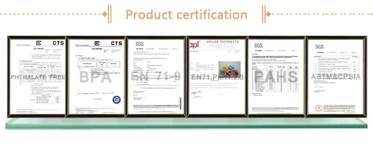 For the top quality of the products, we insist using the best raw materials -- LG PVC Powder and BASF Dinch PVC oil. All the products have passed international certifications, such as EN71, ASTM, Reach, Phthalate free, Lead Free, PAHs, RoHS, Low Cadmium, EN62115, etc.