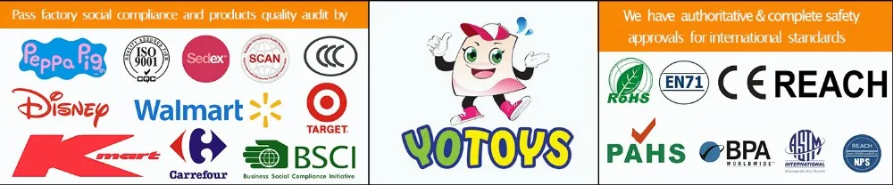 Last but not least, Yotoys have been passed ISO9001-2008, BSCI Audit, Walmart Audit, TRU Audit, Target Audit,GSV Audit, Sedex Audit, Disney Audit, Carrefour Audit, M&S Audit, Debenhams Audit, K-mart Audit, SCAN, etc.