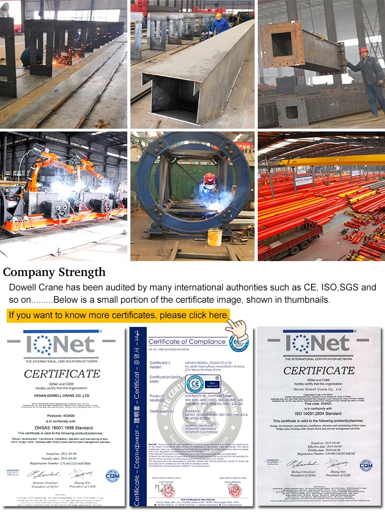 Henan Dowell Crane Co., Ltd is a China-leading group of crane businesses which was founded in 1955, And serving a broad range of customers all over the world to provide a complete set of advanced lifting project, including Gantry crane, Bridge crane, Jib crane, Accessory. a). Henan Dowell Crane Co., Ltd has already obtained the CCC,CE,BV,SGS,ISO OHSAS certifications and has won over 60 honors. b). Our company offers services for more than 5000 companies, and the products are polular in more than 100countries.