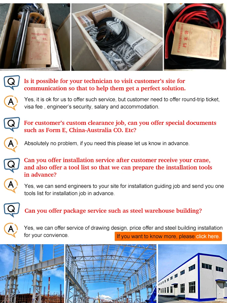 1.Hoist and electric parts will be packed by plywood crate, for avoiding the demage from goods crash and impact during the delivery.