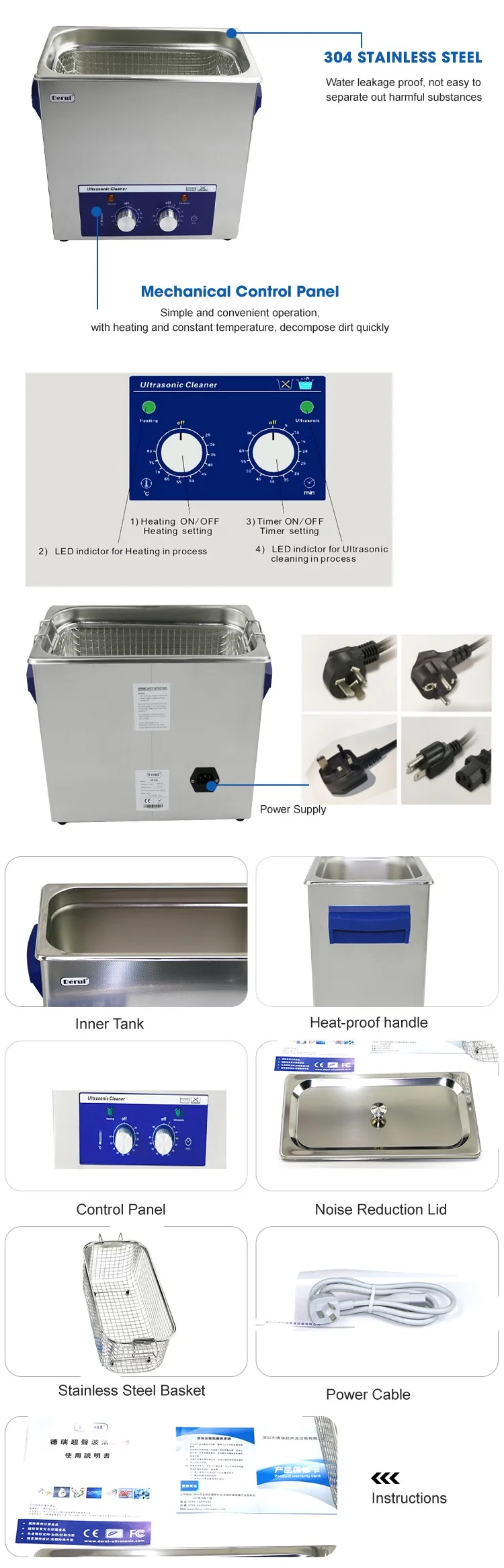Shenzhen Derui Ultrasonic Equipment Co., Ltd is a professional manufacturer and exporter of ultrasonic cleaner, Since 1998 our company began to research the first generation of digital ultrasonic cleaning machine to now work the way it excited type, with more than 14 years experience in the design and manufacture ultrasonic cleaners, with the design, development and production of diverse range ultrasonic cleaner including lab, dental, medical sectors, opticians, ophthalmology, jewelry branch, watchmaker branch tattoo, electronics, industry, workshop etc.Our well-equipped facilities and excellent quality control meet the evaluations of CE and have RoHS certifications, throughout all stages of production enable us to guarantee total customer satisfaction. excellent performance and complete certificate ,all are major factors to make our products are sold to all over the world with its good after-sales service system, and with relatively high market share in US,UK, Germany, Janpan and other developed countries.