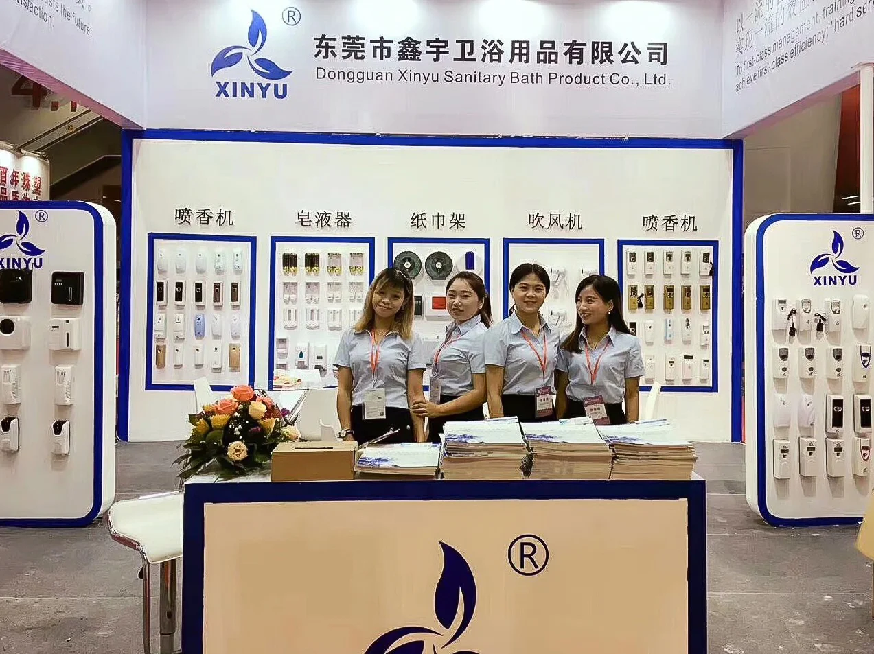 Dongguan Beya Xinyu Industry Co.,Ltd. was established in 2012, is a company specializing in the production of aerosol dispenser,LCD aerosol dispenser,remote control aerosol dispenser,aroma diffuser,air freshener,automatic/hand press soap dispenser, hand dryer,hair dryer,paper tissue dispenser,tissue box,sensor disinfection dispenser machine,tracy for hotel,urinal screen mat and other sanitary products,use for hotel,bathroom,home,school,hospital and other public place.