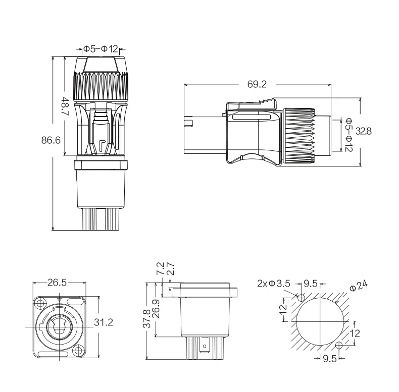 Terminal Method | Screw for the plug, soldering for the panel socket |