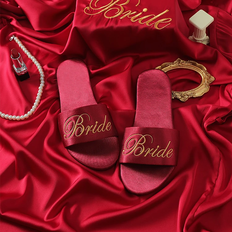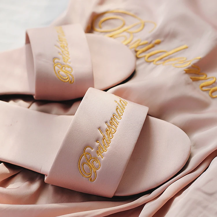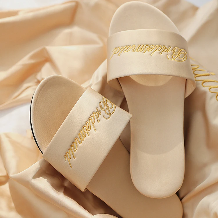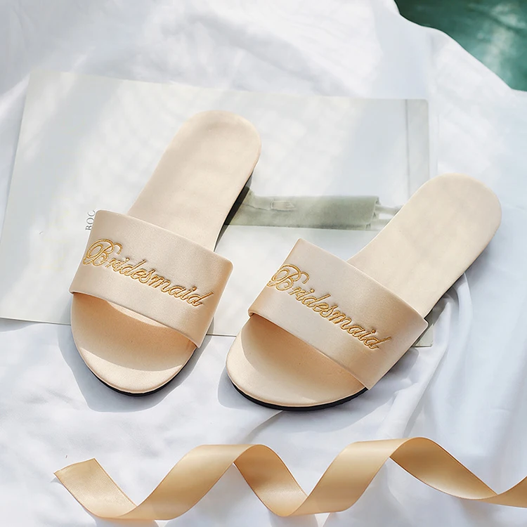 Женские летние сандалии на плоской подошве с вышивкой заказ; Повседневные свадебные атласные шлепанцы для невесты