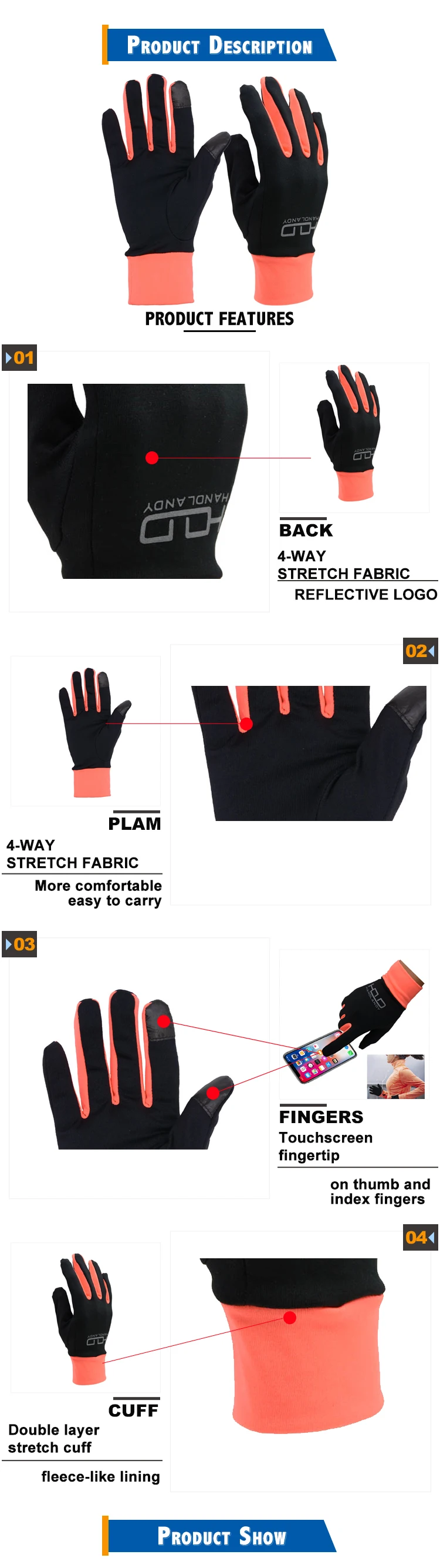 Feature: | Knitted fabric offer stretchy good fitting/flexiable/Breatbable, screen touching finger tips,warm, adjustable elastic cuff stop the wind and dust. |