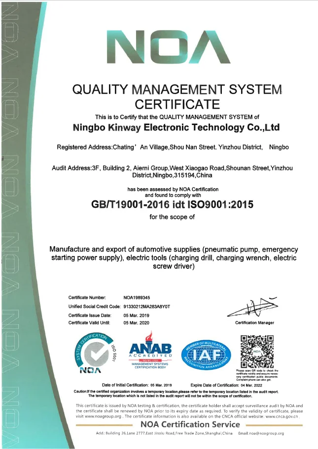 NINGBO KINWAY ELECTRONIC TECHNOLOGY CO.,LTD established in 2016, is a professional company engaged in the research, development, sale and service of lithium battery power tools for many years.