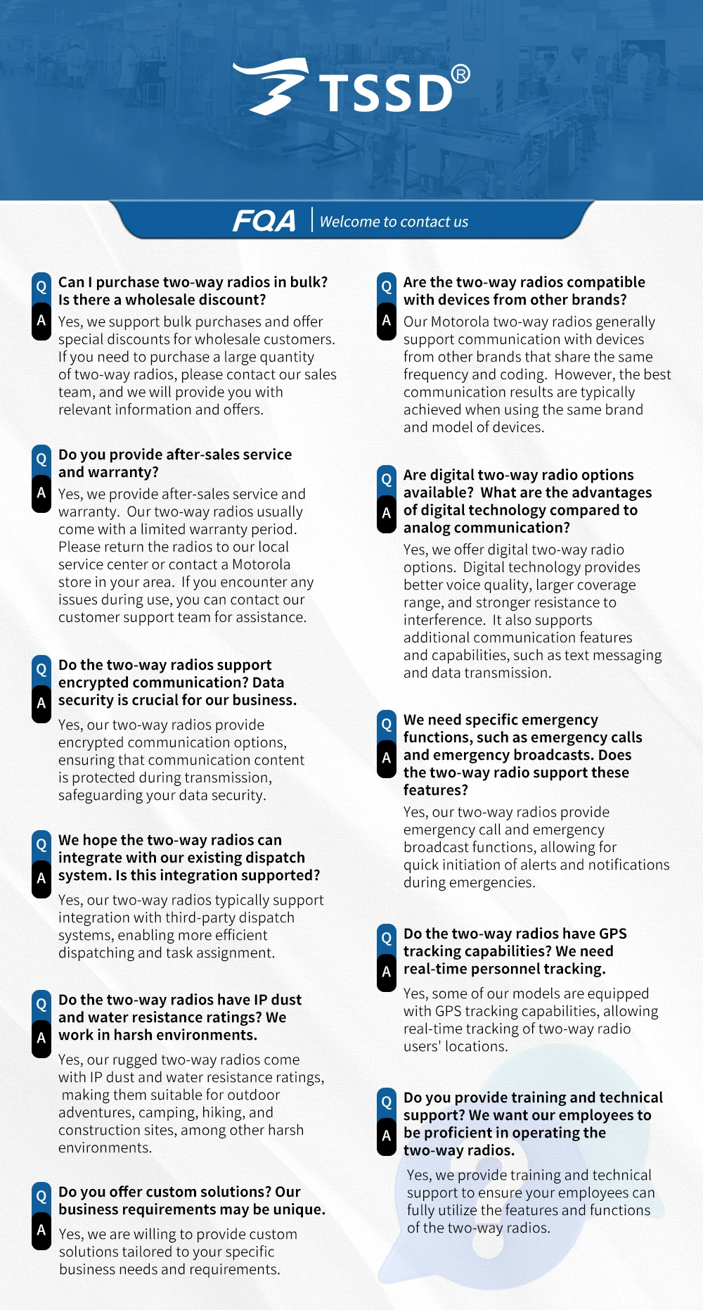 We take pride not only in being authorized agentsand distributors of Motorola products but also inproviding excellent service to our customers.Beforemaking a purchase, we carefully listen to your needsand tailor the most suitable solutions for you. weoffer comprehensive after-sales support, includingequipment training, technical consultation, andrepair services.