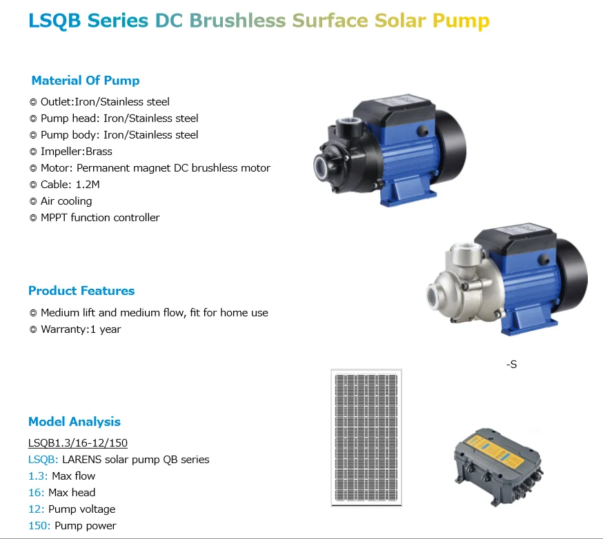 1. Мощность солнечной панели = мощность насоса X 1,3, напряжение солнечной панели = Напряжение насос, контроллер должен быть согласован