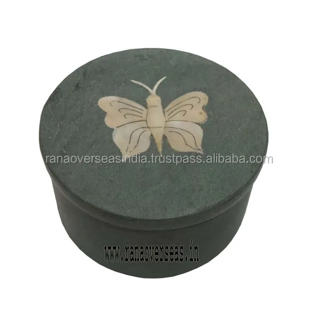 Soapstone Jewellery Box | Handmade Decorative Soapstone Storage Box With Lid And Butterfly Pattern In Round Shape | ROUND - 3" , 4" | 2.00 - 3.00 |