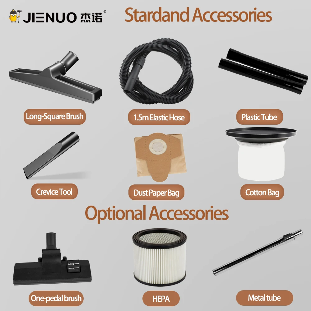 Accessories Included | ①Long-Square brush②1.5m elastic hose ③plastic tube ④cotton bag ⑤Crevice tool⑥Dust paper bag | |||||