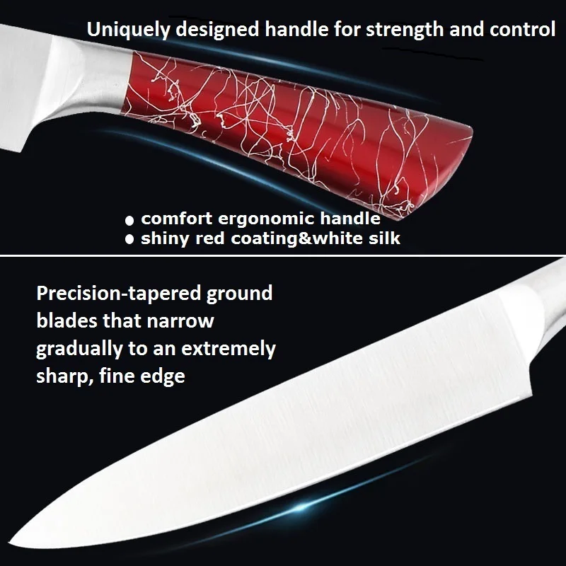 The comfort ergonomic handle painted red shiny coating & white silk fit perfectly in your hand to maximize control and ensure comfort when your are cutting, slicing, mincing and chopping fruit, meat, sushi, and salad dish and all foods & cakes.