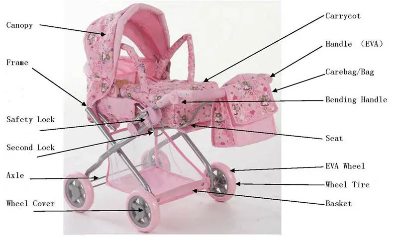 | Особенности | 1. EVA ручка 2. с тканевым навесом 3. Съемное колесо ось 4. соответствует стандарту EN71 и ASTM 5. Съемная люлька и с небольшой корзиной |