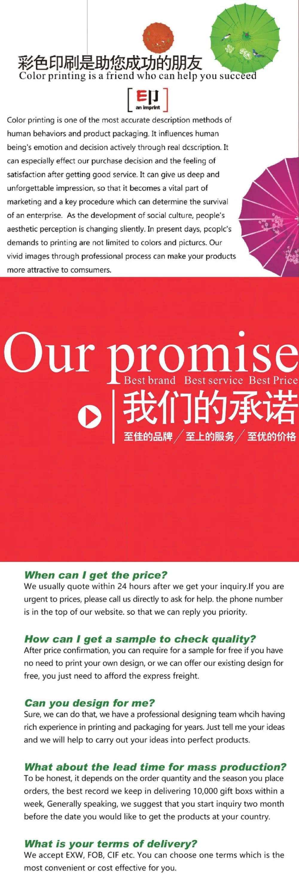 was founded in1995.We own a factory covering about 20,0OO square meters. Wehave more than 200 employees. Our company has passed the standard attestation of ISO9OO1-2000 International Quality System.We conduct our management under ERP system. We can produce various medium and top grade printing products according to customers' requirements. Our products include gift boxes, poker cards, UV game cards, color boxes, puzzles, color cards, hang tags, note books, desk calendars, brochures, paper bags, paper stickers,etc. As a professional manufacturer of printing products, we own self-contained and advanced equipment and many skilled technicians, so we can make sure that our clients can enjoy specialized service during the whole procedure from designing and plate making to packaging.