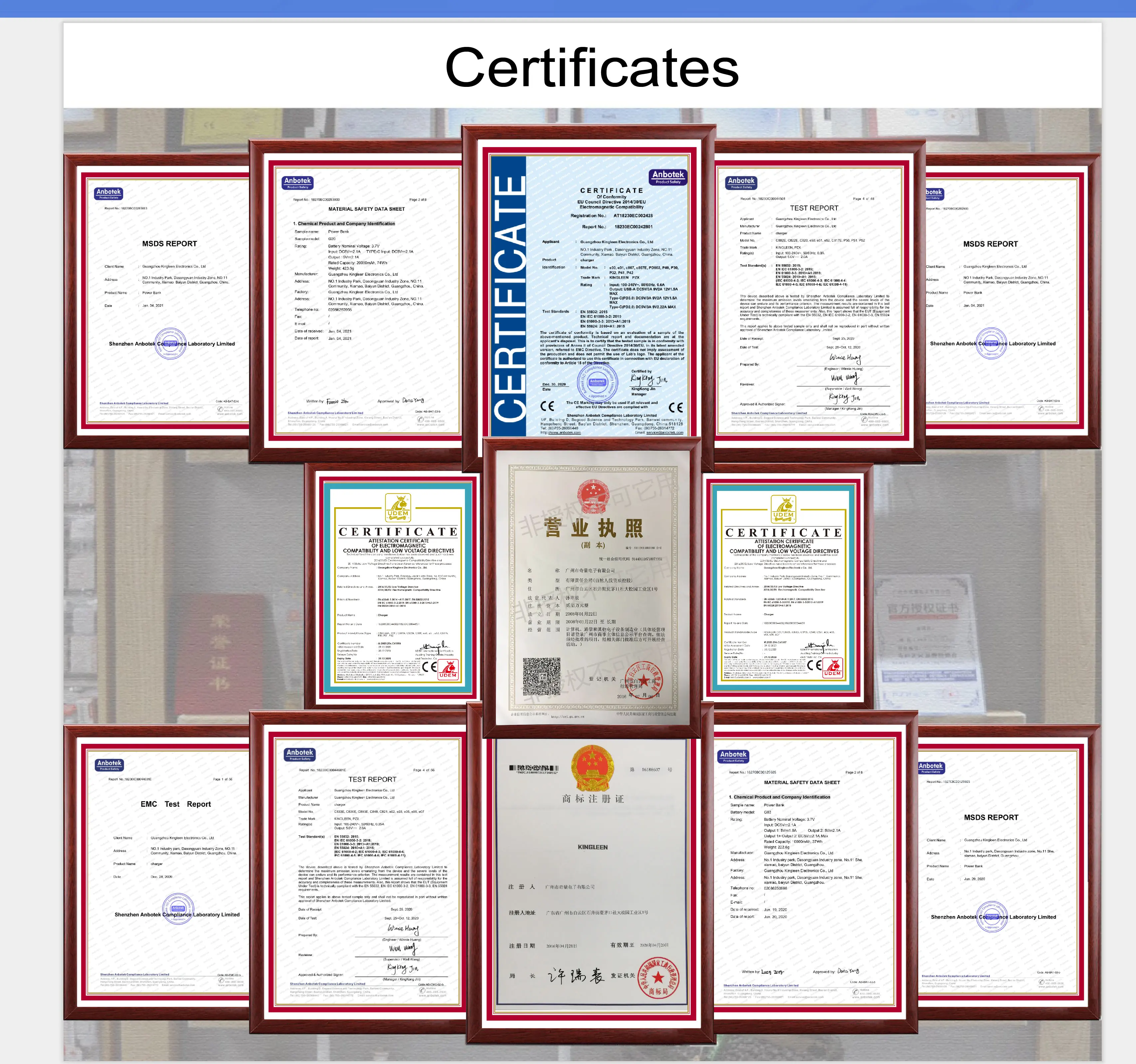 KINGLEEN Group is located in Guangzhou Post Industrial Guangqing Park, with an area of 35,000 square meters and a building area of 100,000 square meters. We own advanced produce devices, test instruments and imported low-temp injection equipments. we have professional manufacture team and management system of purchasing raw materials, productive technology, finished goods inspection. In the whole process of research, development and production, all batteries with AAA cores and imported dual IC protections. All products own full CE, RoHS, FCC & ISO9000: 2000, pass 5 procedures of quality inspection to ensure the rate of qualification.