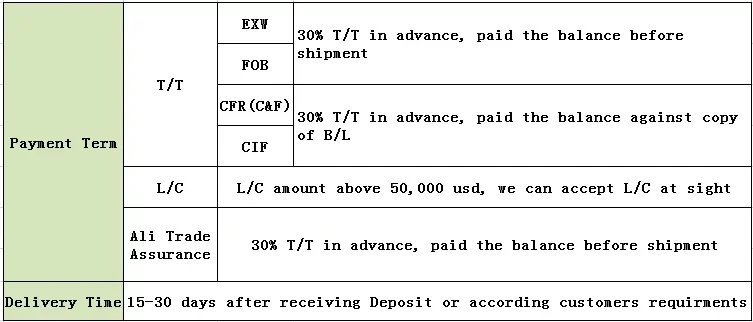 A: Payment<=1000USD, 100% in advance. Payment>=1000USD, 30% T/T in advance ,balance before shippment.
