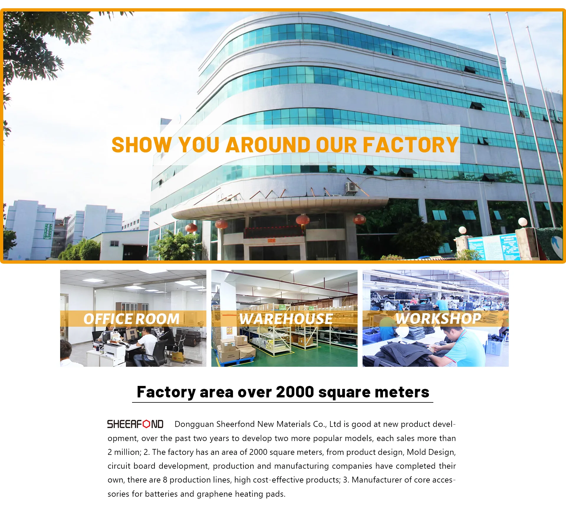Dongguan Sheerfond new Materials Co., Ltd. is a wholesale company that manufactures good & high quality heated clothes, starting from 2006. The company provides the customized products and OEM service. Various new collections and design are coming out each month with the current styles and fabrics. The factory own the proficient skill and updated machine, This company has several series of heating products, such as electric clothes, electric pads, electric vests, electric jackets, electric socks, electric shoes, electric elements and so on.